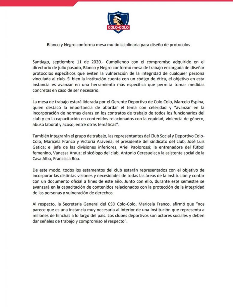 En la misma línea, el gerente deportivo de Colo Colo, Marcelo Espina, quien liderará la instancia, destacó la importancia de “avanzar en la incorporación de normas claras en los contratos de trabajo de todos los funcionarios del club y en la capacitación en contenidos relacionados con equidad, violencia de género, abuso laboral y acoso, entre otras temáticas”.