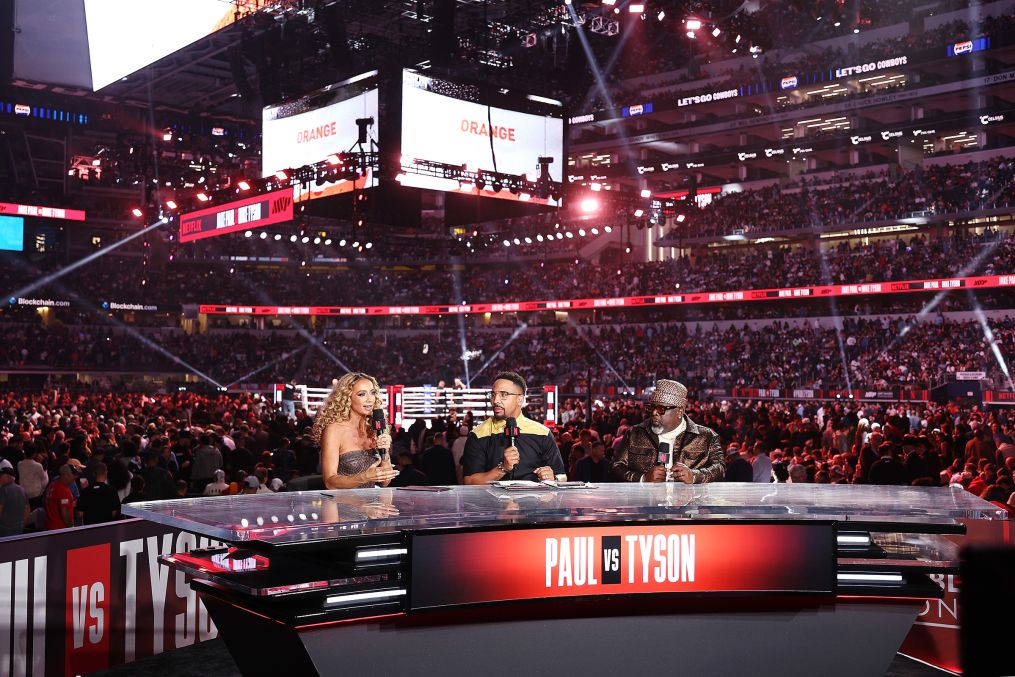 De izquierda a derecha: Kate Abdo, Andre Ward y Cedric the Entertainer hablan durante la transmisión EN VIVO en Netflix: Jake Paul vs. Mike Tyson. Brett Carlsen/Getty Images para Netflix.