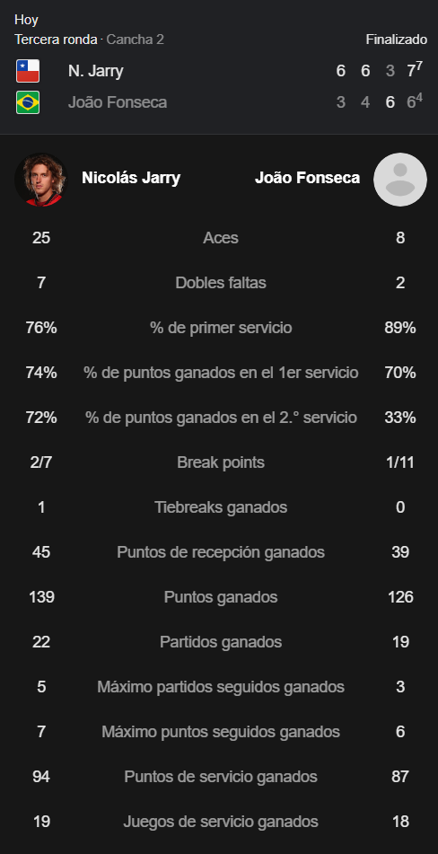 El tenista Nicolás Jarry ?? (143º) avanzó por primera vez en su carrera a los octavos de final de Wimbledon ??, tras superar a Joao Fonseca ?? (54º) por 6-3, 6-4, 3-6 y 7-6 (4).