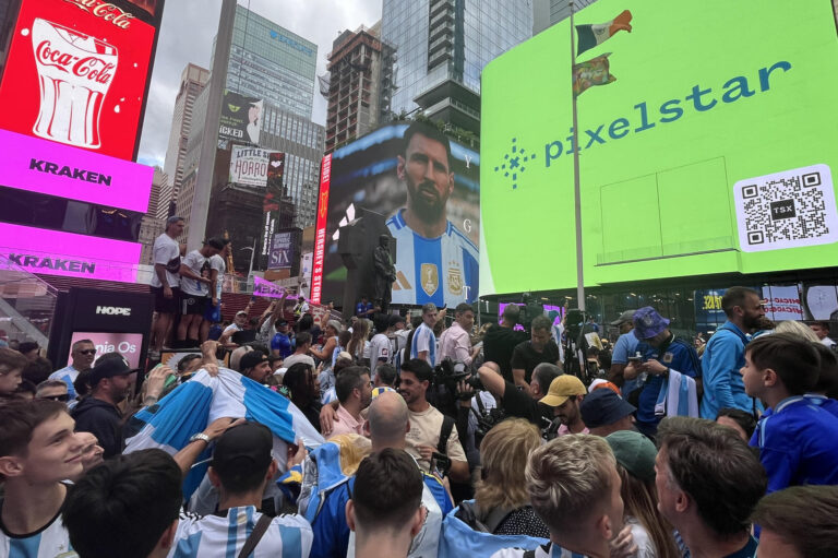 Entre cánticos para celebrar el cumpleaños de Lionel Messi y la arenga para enfrentar a La Roja este martes, los argentinos se congregaron en Times Square.