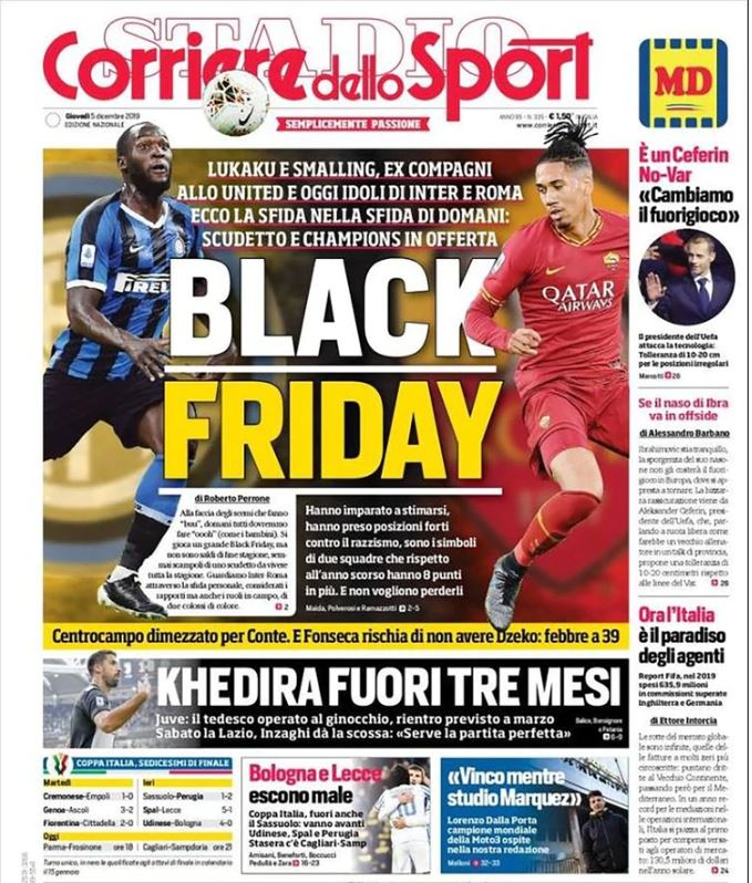 En la portada pusieron “Black Friday” (viernes negro), para promocionar el partido de este viernes entre el Inter de Milán y la Roma, y en la imagen aparece Romelu Lukaku (Inter) y Chris Smalling (Roma), ambos jugadores de raza negra.