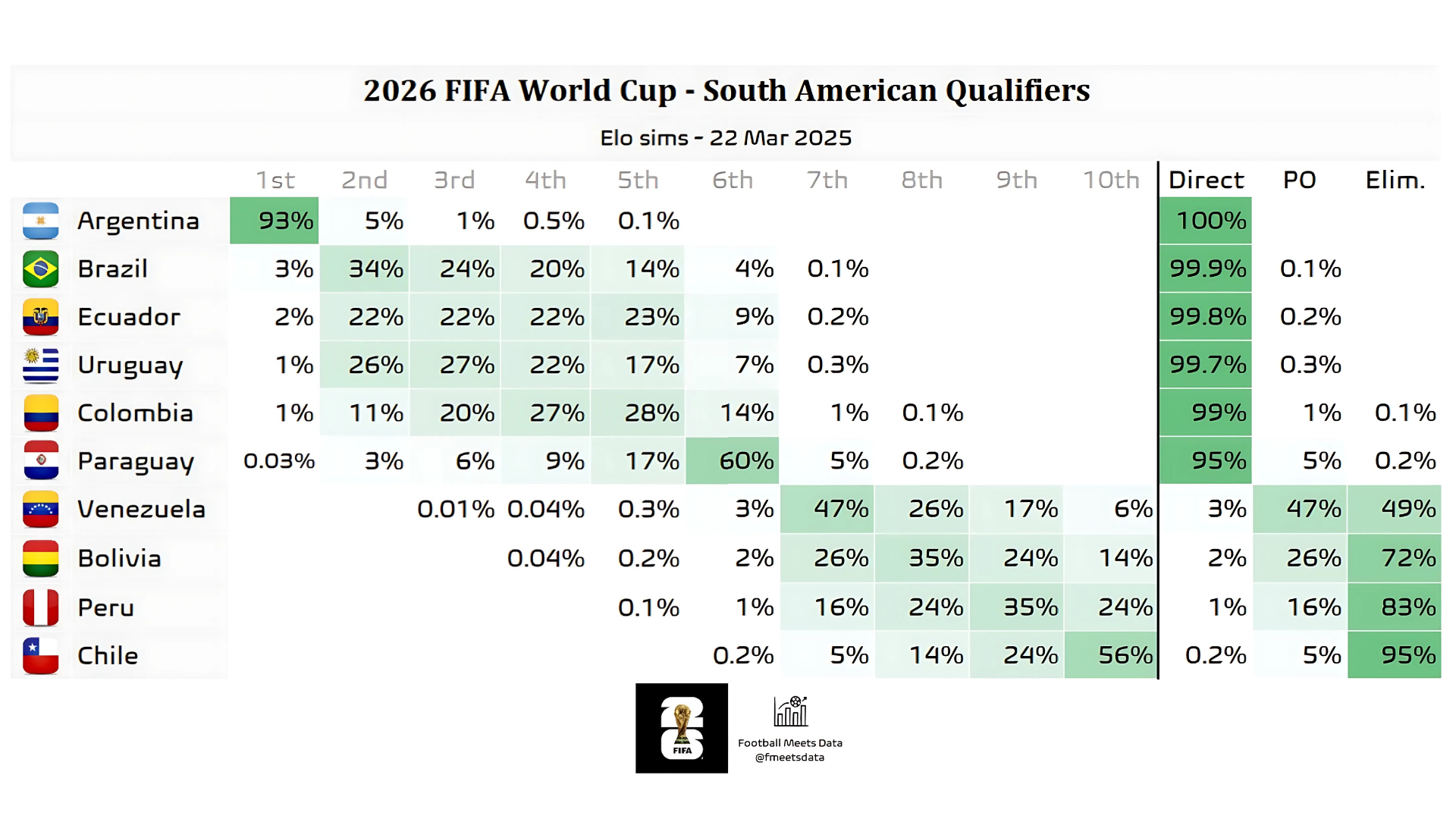 De acuerdo con un análisis de probabilidades realizado por Football Meets Data, basado en las cifras de Conmebol, hecha el 19 de marzo de 2025, La Roja solo tiene un 0,2% de posibilidades de clasificar de manera directa al torneo y un 5% de acceder al repechaje intercontinental.