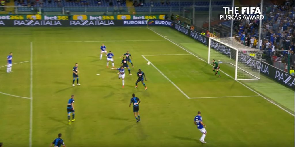 De taquito no vale doble, pero una acrobacia como esta tal vez debería. A sus 36 años, el delantero de la Sampdoria se sabe el arco de memoria y le pegó sin mirar para dejar petrificada a toda la defensa del Napoli. Como jugó ahí, no lo festejó.
