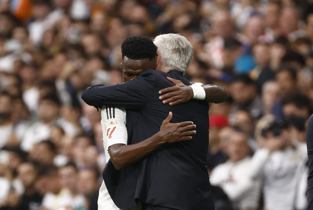 El delantero brasileño del Real Madrid Vinicius Junior celebra uno de sus goles junto a su entrenador, el italiano Carlo Ancelotti, durante el partido de la jornada 13 de LaLiga entre Real Madrid y Osasuna, en el estadio Santiago Bernabéu en Madrid.-EFE/ Daniel González