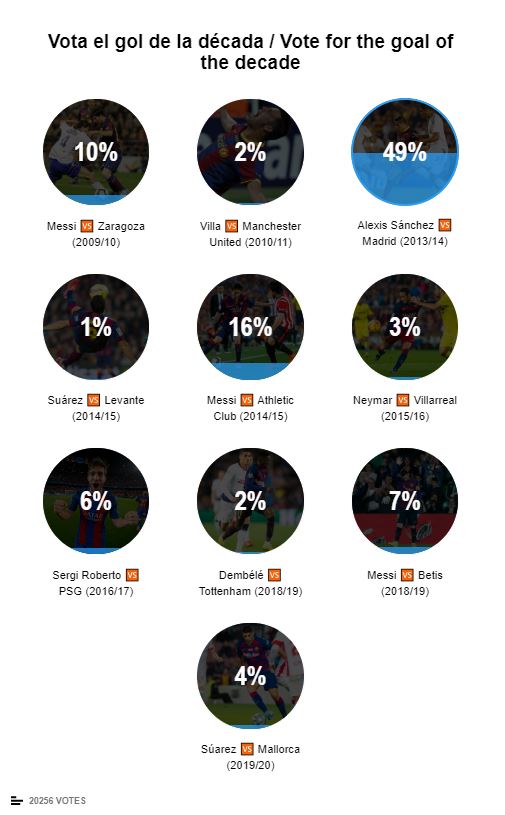 La genialidad del chileno tiene un 49% de las preferencias (al momento de redactar la nota). Segundo y tercero aparecen goles de Lionel Messi. Se puede votar a través de la página web del Barcelona.