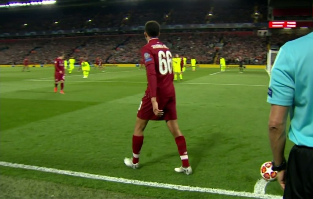 Rápidamente, Alexander-Arnold se devolvió a la esquina para apurar el remate. Shaqiri, quien ya había entendido la jugada con la mirada anterior, siguió siendo cómplice: miró para abajo haciéndose pasar por el tirador designado. Jordi Alba notó que apuraron el centro, pero ya era tarde.