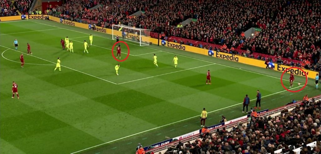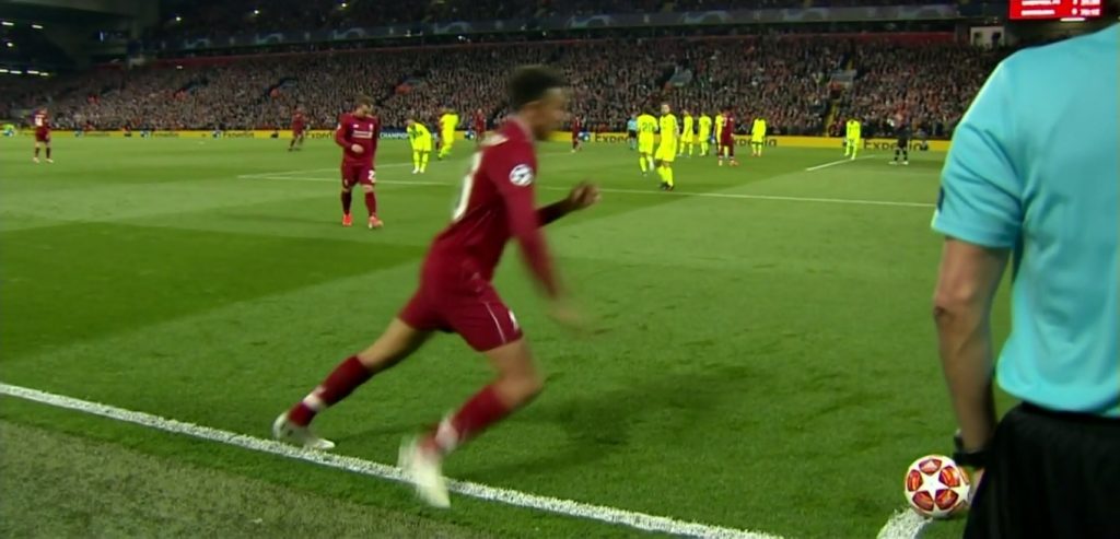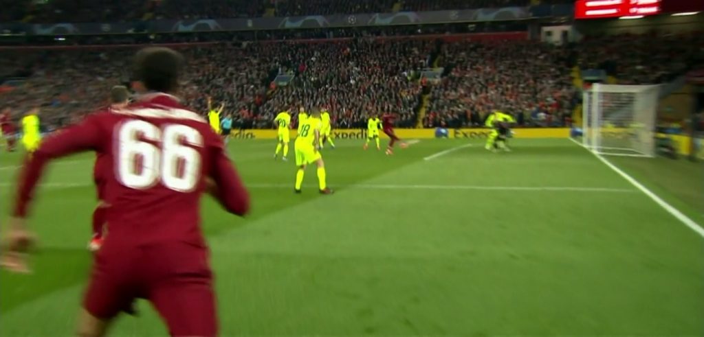 Posiciona Alexander-Arnold, pero Shaqiri le dice que pare. Él va. Hay tiempo para planear la jugada y retomar posiciones. Los atacantes en el área incluso se resienten por el cansancio.