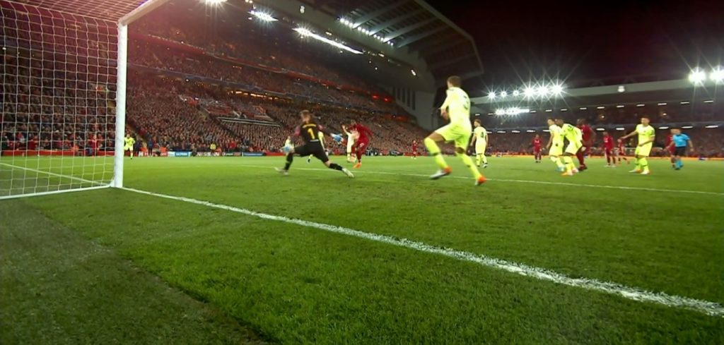 Sale el centro a media altura (y Shaqiri ni miró). Origi se perfila sin problemas para recibir y conectar con pierna derecha. Cuatro jugadores, incluyendo a Ter Stegen, están completamente distraídos. El golero culé incluso está mirando al otro lado alentando a los compañeros.