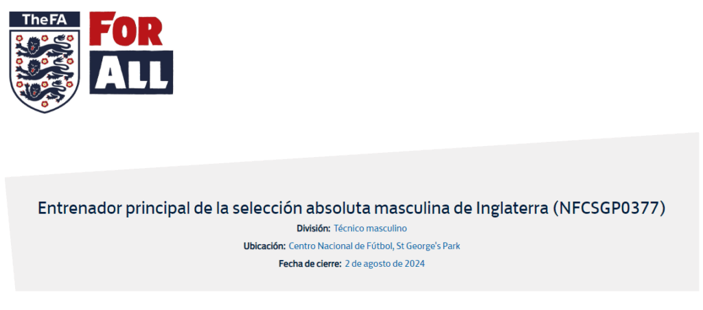 Entre los requisitos detallados se incluyen dirigir y desarrollar al equipo para ganar torneos importantes, proporcionar liderazgo al equipo técnico en St. George’s Park y mantener relaciones sólidas con clubes que empleen jugadores ingleses.