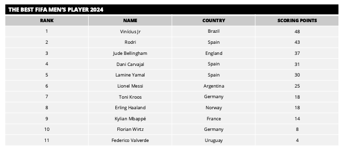 Vinicius lideró la votación con 48 puntos, superando a Rodri, mediocampista del Manchester City (43 puntos), y a su compañero de equipo, Jude Bellingham, quien completó el podio con 37 puntos.