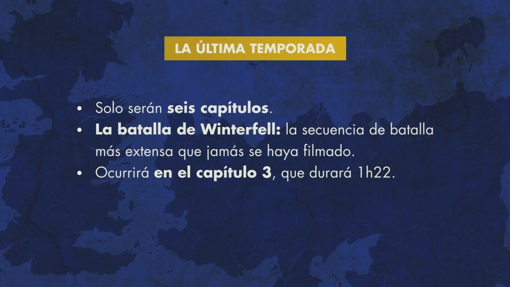 “Es lo que todos estamos esperando. Toda esta facción que está en Winterfell va a tener que enfrentarse a lo que ya se sabe se va a llamar “La Batalla de Winterfell”. Es una batalla que incluso, en la producción, representó un esfuerzo tremendo, fue muy demandante para todo el elenco, para todo el equipo, grabaron durante 11 semanas todas las noches consecutivamente”, afirmó.