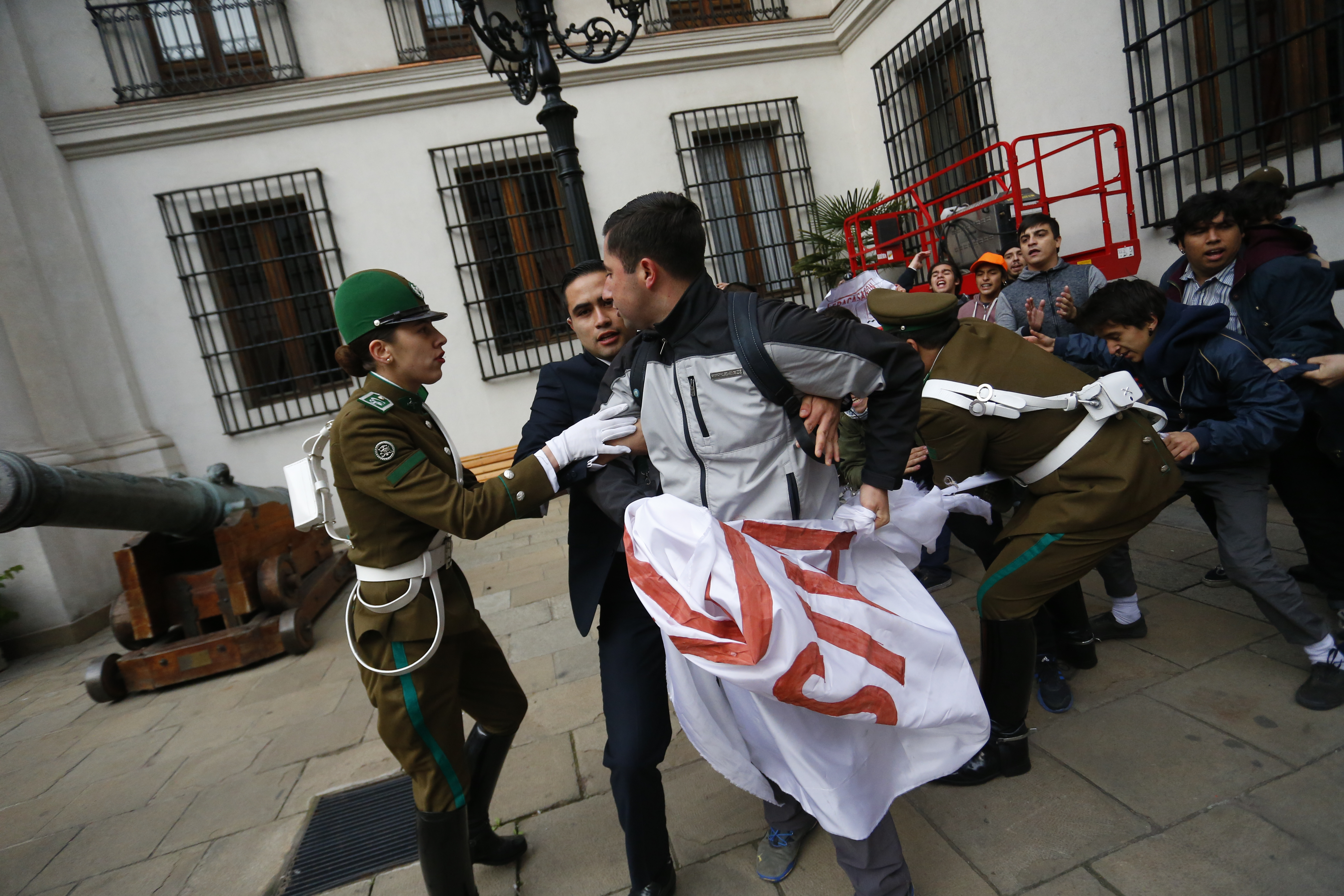 La idea era no levantar sospechas, por lo que, con gorros y bolsos naranjos, el martes 24 de mayo del 2016 una veintena de jóvenes logró ingresar al palacio de gobierno haciéndose pasar por turistas. ¿El objetivo? Protestar contra la presidenta Michelle Bachelet, quien en la Cuenta Pública de aquel año no expuso los anuncios que los estudiantes esperaban, calificando estas como dirigidas al empresariado.
