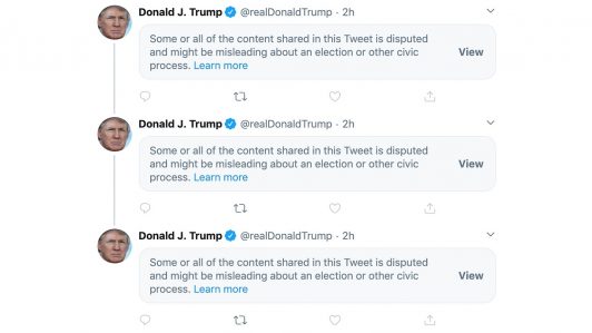 Los tuits de Trump, muchos de los cuales han recibido etiquetas de advertencia de Twitter, se han quejado de que el proceso legítimo de contar los votos ausentes equivale a que le roben la contienda.