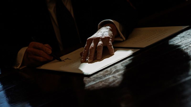 El presidente Donald Trump firma un decreto en la Oficina Oval de la Casa Blanca. Samuel Corum/Sipa/Bloomberg/Getty Images