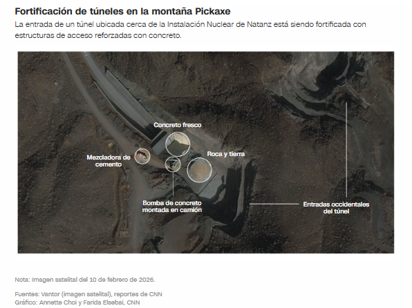 Imágenes satelitales de alta resolución del 10 de febrero de 2026, analizadas por ISIS, muestran que Irán continúa reforzando las entradas de los túneles del complejo subterráneo excavado en la montaña Pickaxe, cerca de Natanz.