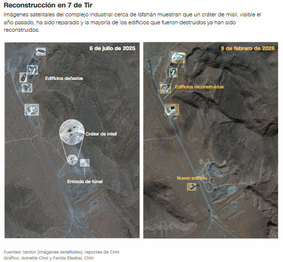 “La reconstrucción de los edificios, así como otra información, sugiere que Irán pudo reemplazar ese equipo o trasladarlo a lugares seguros bajo tierra antes de los ataques”, añadió.
