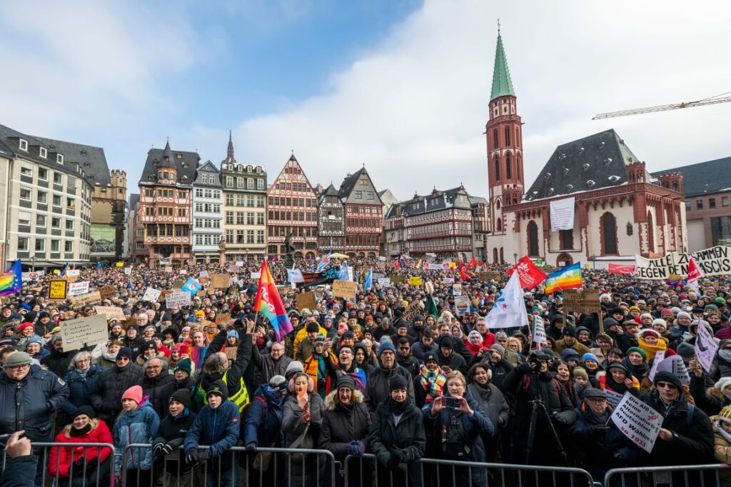 La gente se reúne para protestar contra la AfD el 20 de enero de 2024 en Frankfurt, Alemania. Thomas Lohnes/Getty Images.