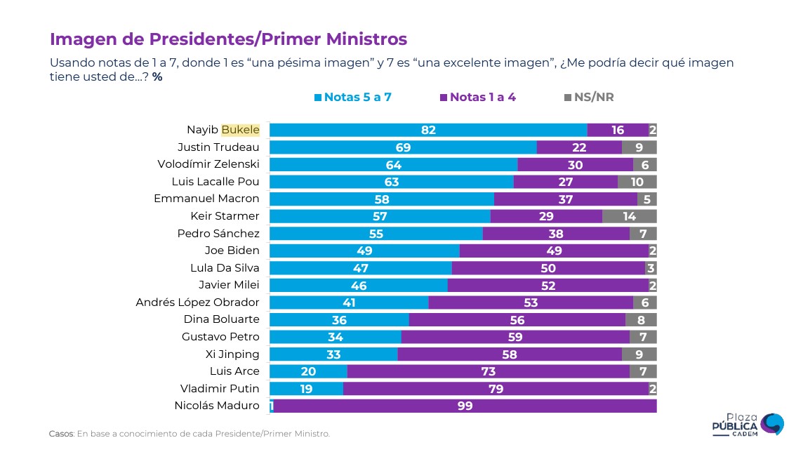 El estudio correspondiente al 4 de agosto pasado reveló que, frente a la consulta por “Imagen de presidentes o primeros ministros”, Bukele es el presidente con la imagen más positiva, con un 82% de valoración, seguido por el primer ministro de Canadá, Justin Trudeau (69%); el presidente de Ucrania, Volodymyr Zelensky (64%); el presidente de Uruguay, Luis Lacalle Pou (63%); y el presidente de Francia, Emmanuel Macron (58%).