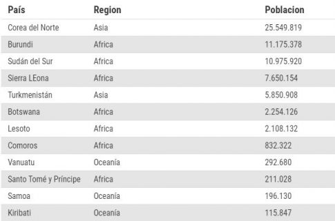 El país con más habitantes de esta lista es Corea del Norte con más de 25 millones, le sigue Burundi que tiene más de 11 millones, y tercero está Sudán del Sur con un poco menos de 11 millones.