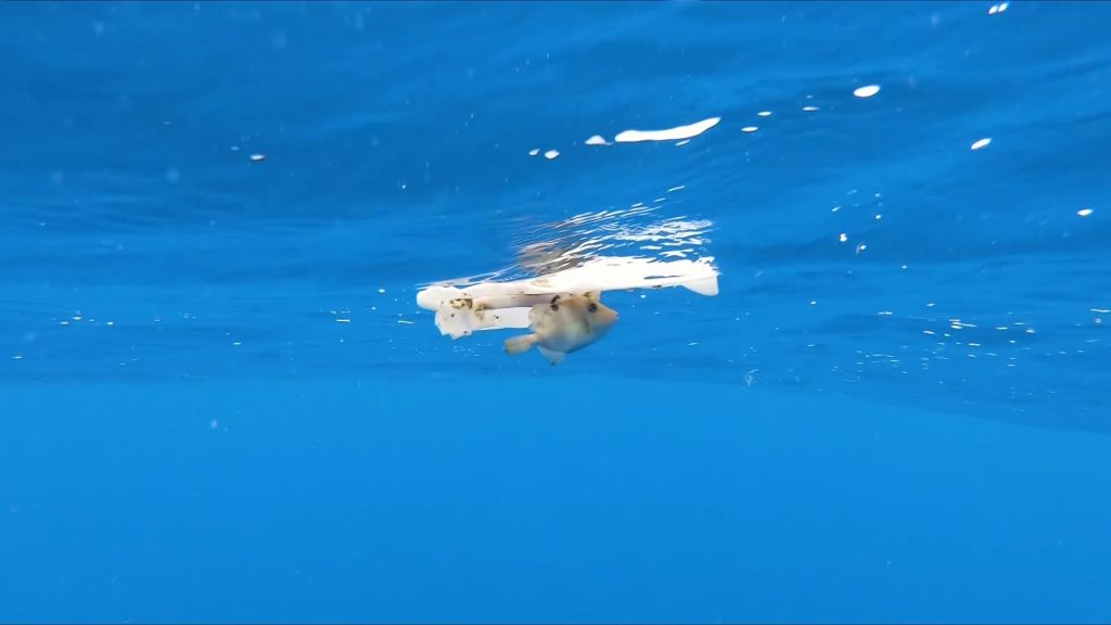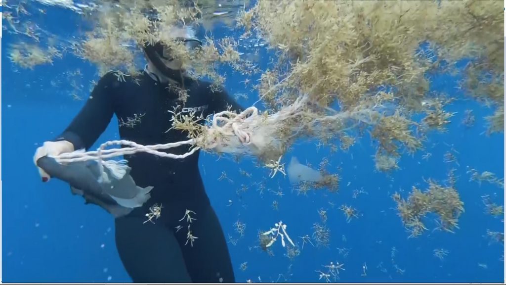 Incrustado en la mayor parte del sargazo están las piezas de basura fácilmente visibles: botellas de champú, equipo de pesca, recipientes gruesos y duros o bolsas blandas delgadas, entre muchos otros tipos de plástico. Uno de los científicos señala marcas de mordeduras de peces en una pequeña lámina de plástico que sacamos. Pero lo que es realmente discordante es cuando te sumerges y miras hacia lo profundo y te das cuenta de que estás rodeado de pequeñas piezas brillantes de plástico roto llamado microplástico.