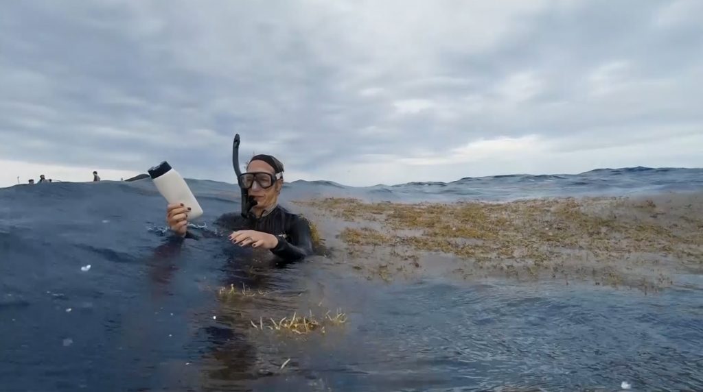 “En la mayoría de las muestras que hemos estado muestreando donde hay sargazo, hemos visto muchos plásticos porque se enredan en las algas”, explica Celia Ojeda, bióloga marina con un doctorado en conservación del océano, señalando pequeñas piezas flotando en la parte superior de una muestra.