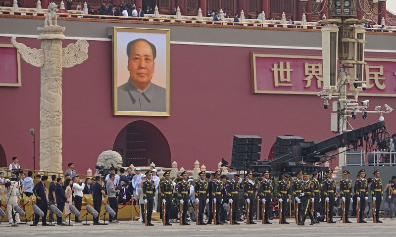 El retrato de Mao se ve arriba de los soldados del Ejército Popular de Liberación de China mientras se alinean frente a la Plaza de Tiananmen.