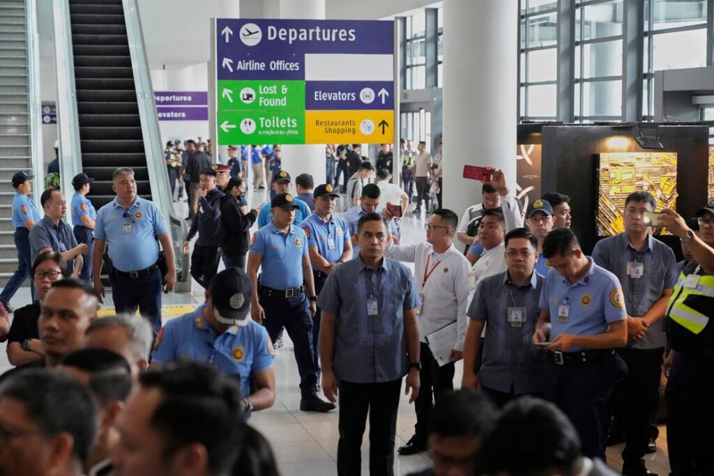 Oficiales patrullan el aeropuerto después de que el expresidente Rodrigo Duterte aterrizara en Manila, Filipinas, el 11 de marzo de 2025. Aarón Favila/AP.