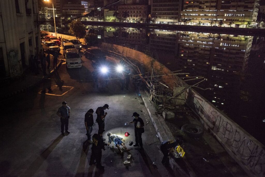 Investigadores policiales inspeccionan el cuerpo de John Estrella, de 18 años, quien presuntamente fue asesinado por agresores no identificados el 26 de junio de 2017 en Manila, Filipinas. Al igual que miles de otras personas que murieron en relación con la campaña del gobierno contra las drogas, el cuerpo sin vida de Estrella fue encontrado presuntamente por policías en una calle oscura con una pistola y sobres de drogas ilegales en su cuerpo. Jesús Aznar/Getty Images.