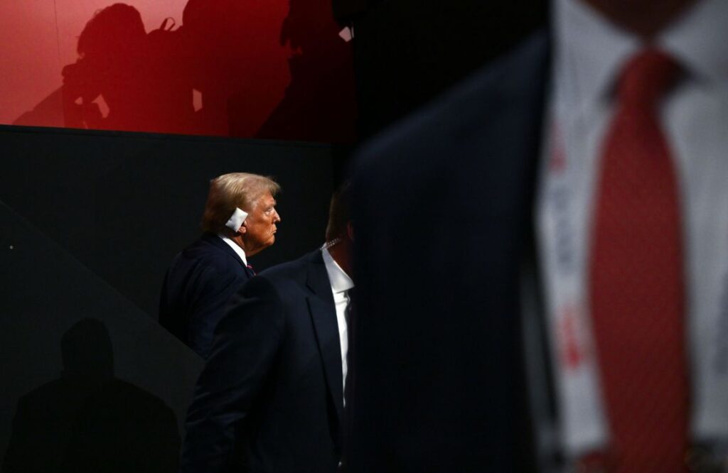 Tres días más tarde, subió al escenario en la Convención Nacional Republicana en Milwaukee con una venda cubriéndole la oreja alcanzada por una bala.