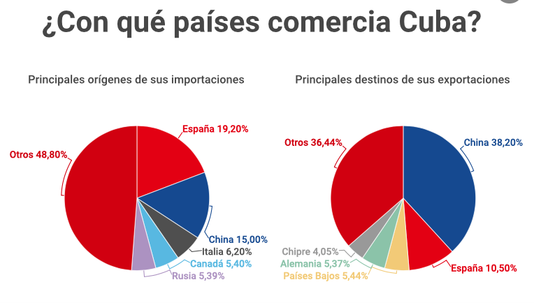 Mientras que Cuba obtiene sus importaciones principalmente de España (19,2%), China (15%), Italia (6,2%), Canadá (5,4%) Y Rusia (5,39%), entre otros.