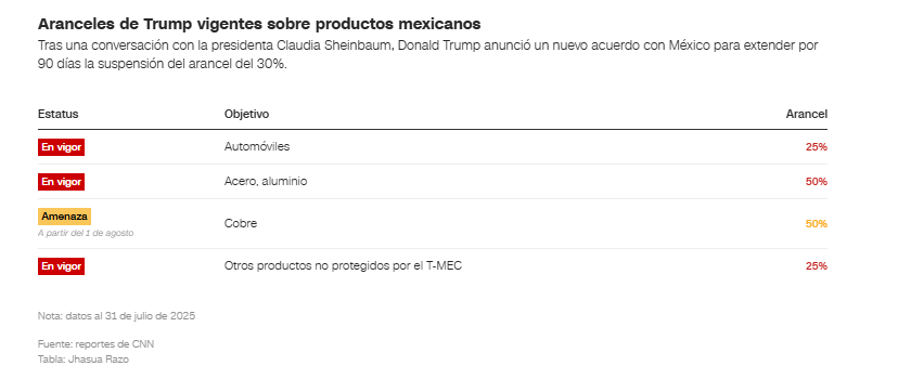 (CNN)– El presidente Donald Trump anunció este jueves la extensión de los aranceles vigentes con México, el principal socio comercial de Estados Unidos, y la suspensión de los aranceles que debían entrar en vigor el viernes. Minutos después, la presidenta de México, Claudia Sheinbaum, confirmó el acuerdo en una publicación de X.