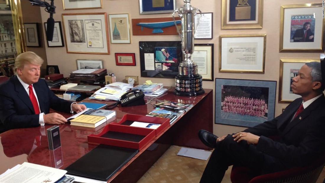 El libro de Cohen, “Disloyal: A Memoir”, no nombra al hombre que supuestamente fue contratado para interpretar a Obama ni proporciona una fecha específica para el incidente, pero sí incluye una fotografía de Trump sentado detrás de un escritorio, frente a un hombre negro que usa un traje con un alfiler de bandera estadounidense pegado a la solapa. Sobre el escritorio de Trump hay dos libros, uno con el nombre de Obama en letras grandes.