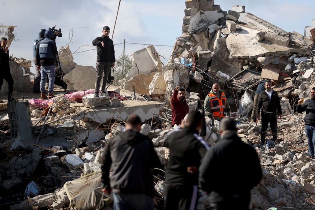 Palestinos inspeccionan los escombros de una casa destruida el 23 de enero en Yenín. Issam Rimawi/Anadolu/Getty Images.