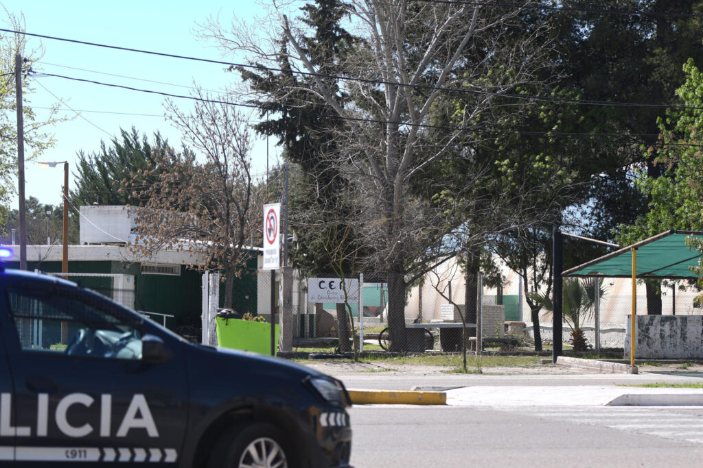 Un vehículo de la policía resguarda una zona a las afueras de un colegio este miércoles, en Mendoza (Argentina). EFE/ STR