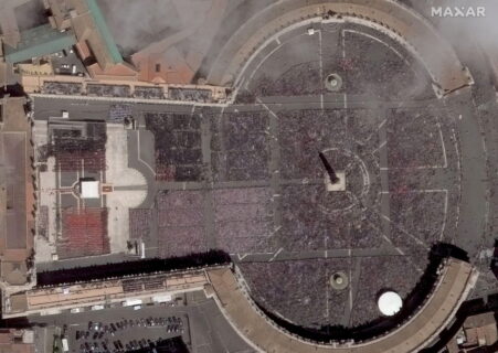 Vatican City (Vatican City State (Holy See)), 26/04/2025.- A handout satellite image made available by Maxar Technologies shows St. Peter’s Square during the funeral Mass of Pope Francis, in Vatican City, 26 April 2025. Pope Francis passed away on Easter Monday, 21 April 2025, at the age of 88. (Papa, Roma)