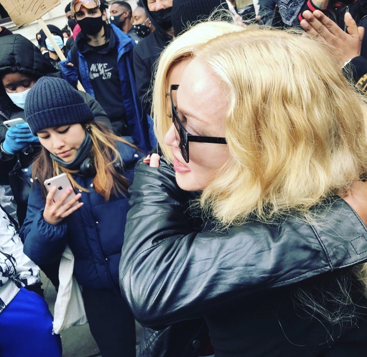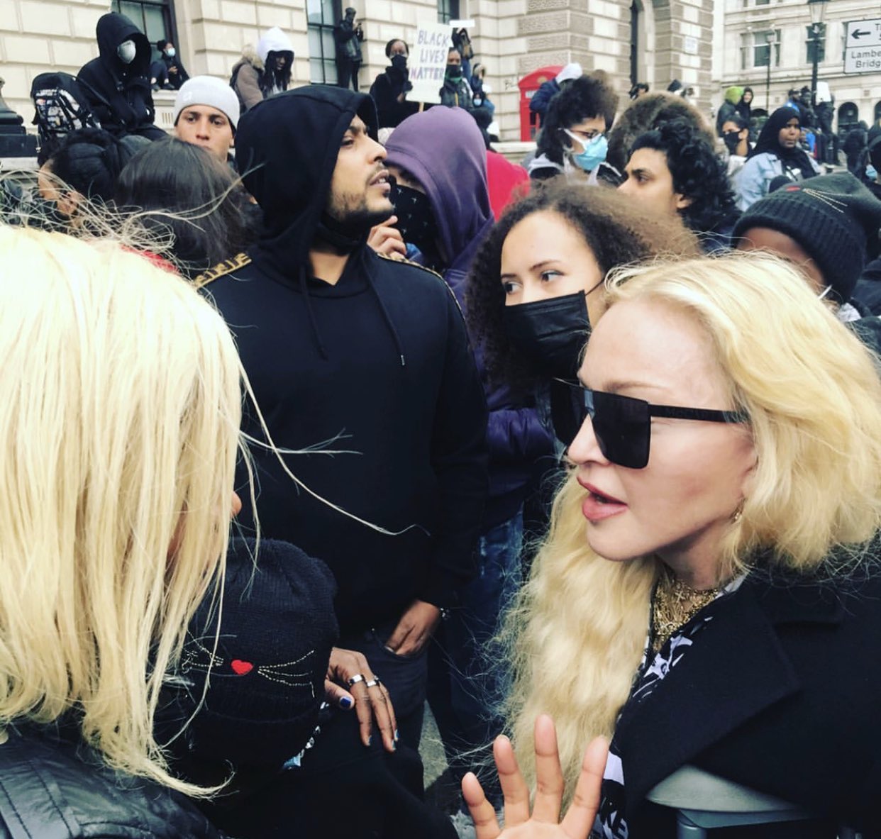 Madonna participó este sábado en las masivas manifestaciones que se realizan en Londres, Reino Unido, en protesta por la muerte por asfixia de George Floyd en EE.UU. a manos de la policía.