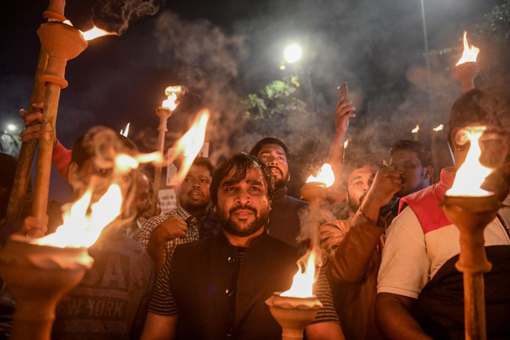 En Assam y Tripura, manifestantes molestos marcharon a través de las ciudades más grandes durante la noche del miércoles y el jueves, sosteniendo antorchas y encendiendo barricadas con neumáticos y cartón.