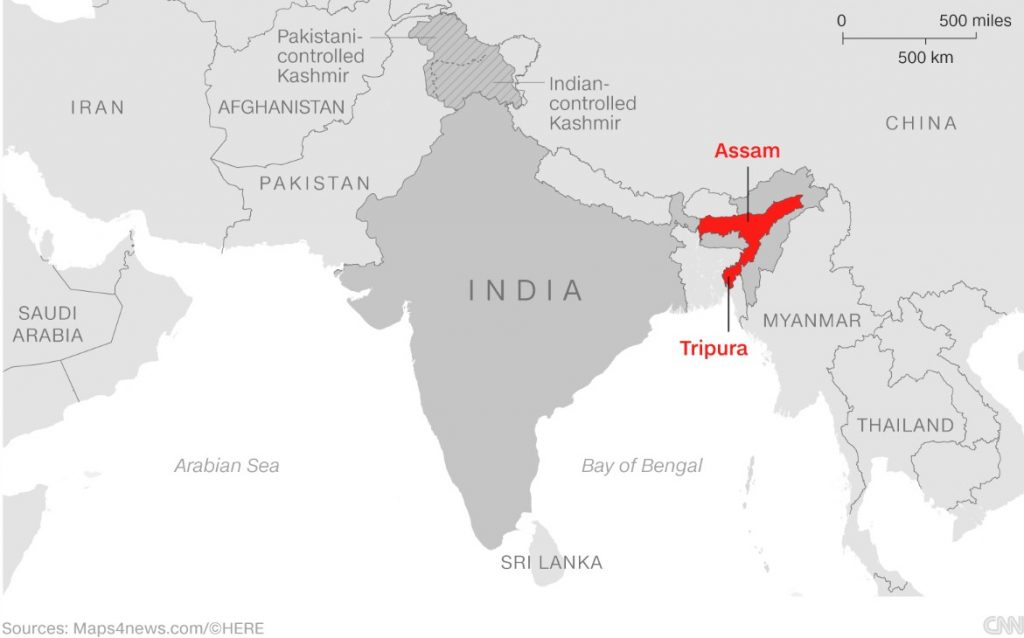 El noreste de india es hogar de más de 200 grupos indígenas minoritarios diferentes. Tanto Assam como Tripura comparten una frontera con Bangladesh y han visto el arribo de extranjeros como una amenaza cultural sin importar la religión; para otros, sentimientos anti-inmigrantes permanecen estrechamente ligados a las divisiones religiosas.
