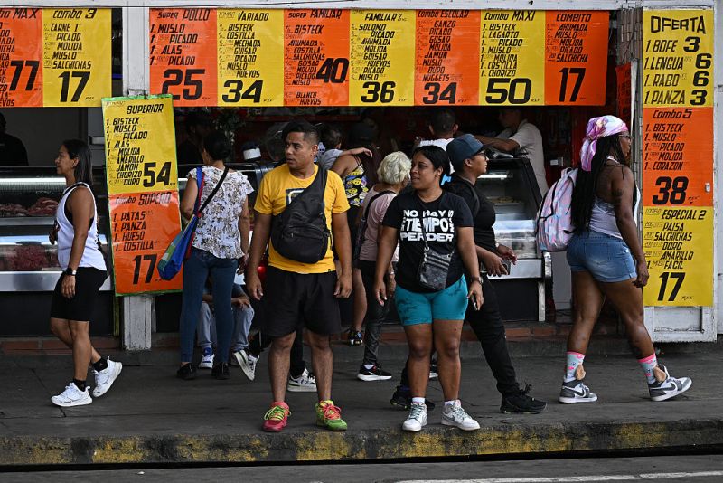 Personas se encuentran frente a una carnicería que exhibe precios en dólares estadounidenses en Caracas, el 14 de septiembre de 2025. FEDERICO PARRA/AFP/Getty Images