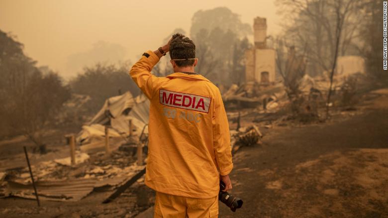 El fotógrafo de ABC Matt Roberts reacciona al ver la casa de su hermana destruida por un incendio forestal en Nueva Gales del Sur, Australia
