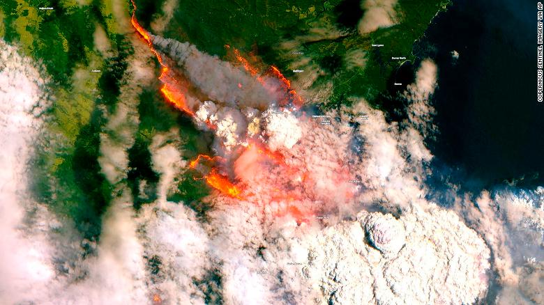Una imagen de satélite publicada por Copérnico Sentinel con fecha 31 de diciembre muestra incendios forestales en toda Australia