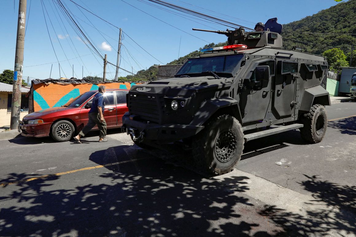 Soldados patrullan un vecindario en San Marcos, El Salvador, en un vehículo blindado el 28 de octubre de 2024, después de que Nayib Bukele anunciara el despliegue de fuerzas de seguridad para buscar remanentes de pandillas. José Cabezas/Reuters.