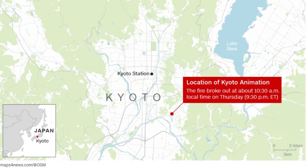 El fuego se desató a eso de las 10:30 hora local el miércoles en el estudio 1 de la compañía en el distrito Fushimi-ku de Tokio. La policía dijo que un residente reportó haber oído un sonido similar a una explosión salir desde el estudio.