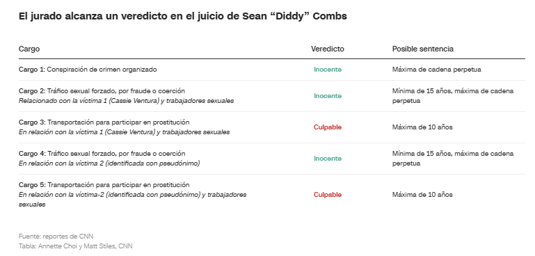 Sean “Diddy” Combs, un magnate de la música que una vez encabezó las listas de éxitos, fue declarado culpable de dos cargos de transportar personas para prostitución en julio, pero fue absuelto de cargos más graves de tráfico sexual y crimen organizado que podrían haber resultado en una sentencia de cadena perpetua.