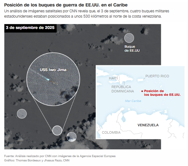 Un análisis de CNN sobre imágenes satelitales obtenidas por la Agencia Espacial Europea (ESA) muestra que cuatro de los buques incorporados al operativo del Comando Sur se encontraban el miércoles en el mar Caribe a unos 530 kilómetros al norte de Venezuela.