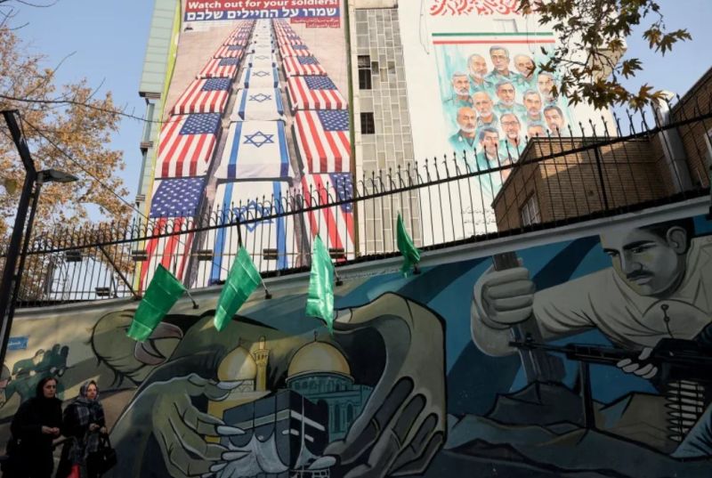 Mujeres caminan frente a una valla publicitaria con mensajes contra Estados Unidos y contra Israel exhibida en un edificio en Teherán, Irán, el 4 de enero de 2026. Majid Asgaripour/Wana News Agency/Reuters.