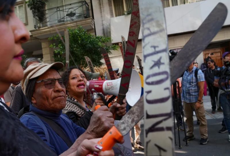 Agricultores de Atenco, con machetes, se concentran frente a la Embajada de Venezuela para protestar contra la captura del presidente Nicolás Maduro por parte de Estados Unidos, en Ciudad de México. Marco Ugarte/AP
