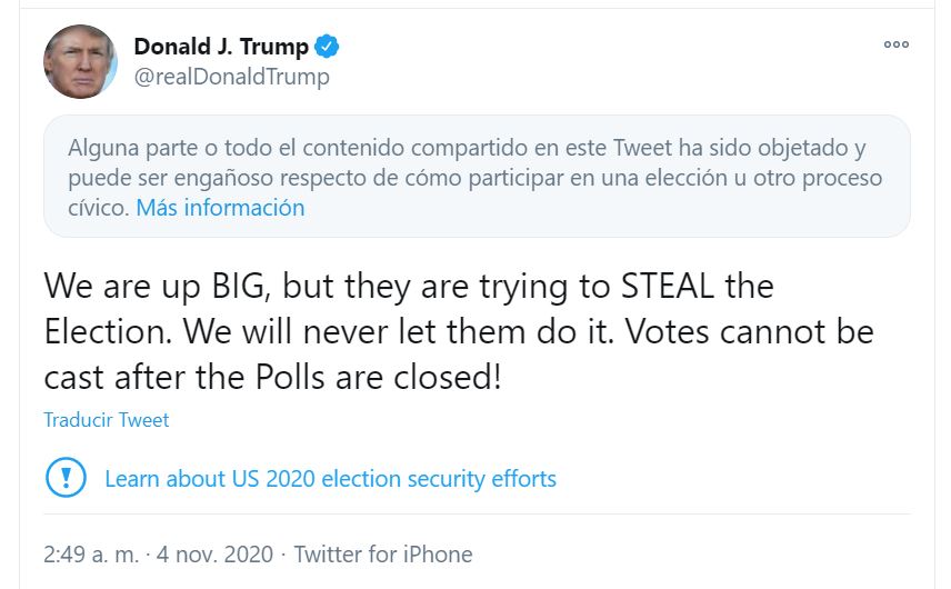 Desde la empresa señalaron que “nosotros ubicamos un señal de alerta en un tuit de @realDonaldTrump por hacer una declaración acerca de la elección que podría llevar a error. Esta acción está en línea con nuestra política de integridad cívica”.