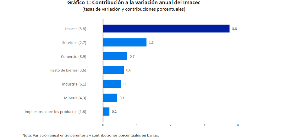 Por su parte, la serie desestacionalizada aumentó 0,8% respecto del mes precedente y creció 2,9% en doce meses. El Imacec no minero presentó un crecimiento anual de 3,8%, mientras que en términos desestacionalizados creció 0,1% respecto del mes anterior.
