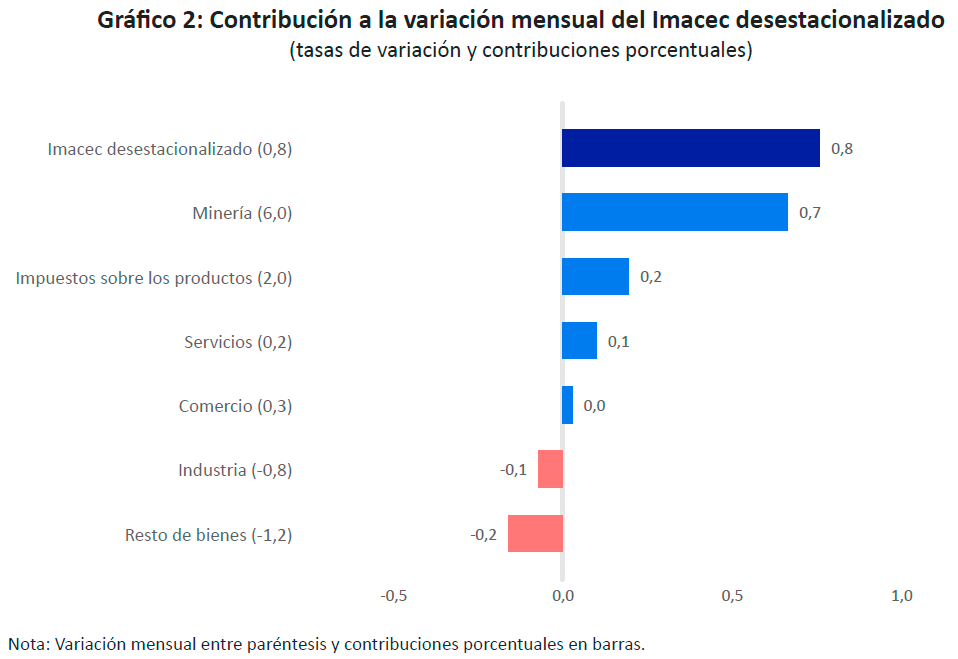 El resultado del Imacec se explicó por el crecimiento de todos sus componentes, destacando el desempeño de la producción de bienes. Por su parte, el aumento del Imacec en términos desestacionalizados fue determinado por la minería.